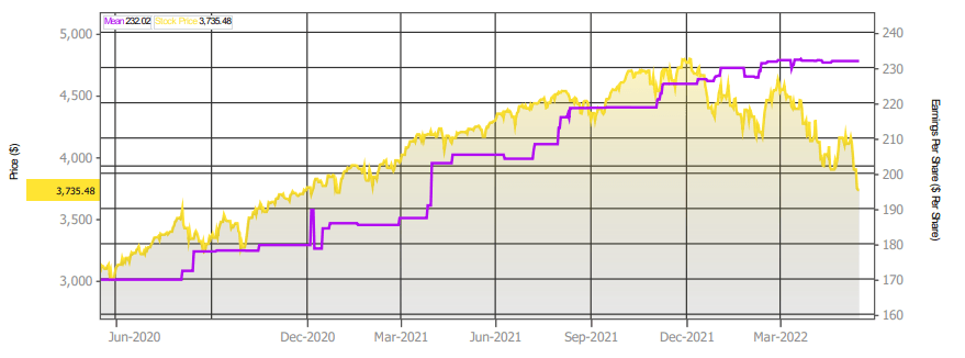S&P 500 index (yellow) versus average EPS estimates (purple), source: Refinitiv.