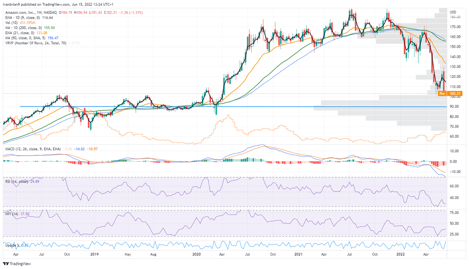 For ease of comparison, we have placed a horizontal line at $90 in the AMZN stock chart below. Volume is significant at the price level, indicating price acceptance and stability. Therefore it is a point of fair value and strong support. It also represents a near-total retracement back to the March 2020 pandemic lows at $81.