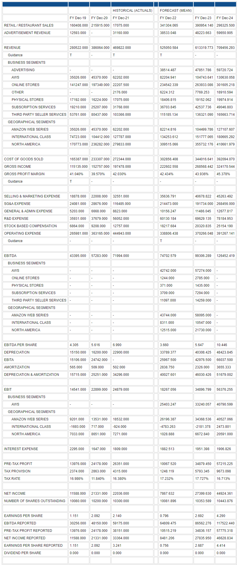 Amazon reported earnings and forecast tables below. These are the foundation for all our DCF models. Data from Refinitiv.