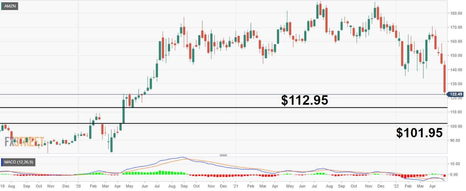 The new support lines come from a consolidation area between April and June of 2020, as seen on the weekly chart below. Current price action near $122.50 is at the top of the consolidation zone, and Amazon stock might have support there. The bottom of the zone, at $112.95, should provide support as well. Falling support could also lead price action to drop to $101.95 in the event that inflation grows worse or prophecies of a recession are made real over the next several months. Notice how the MACD on the weekly chart remains bearish, unlike the daily.