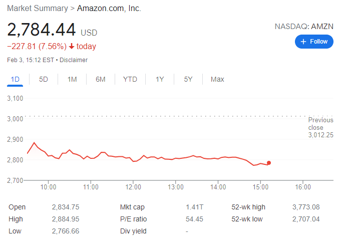 Previous update: AMZN shares unexpectedly dropped ahead of earnings coming Thursday after the close. Fifteen minutes into Thursday's regular session, AMZN stock is down 5.2% at $2,855. The NASDAQ is down 2.2%, and most of the market carnage appears to be a consequence of Facebook's (FB) (now Meta Platforms) spectacular 25% plunge.