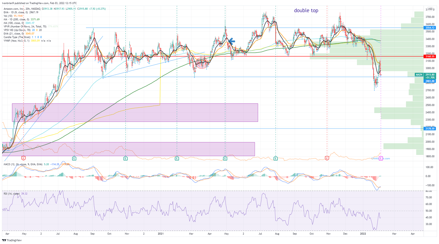 If earnings do perform and the stock appreciates, the first target or resistance level is at $3,191. This is the point of control and also the lows from both August and October 2021. That will end the double top dominance currently at play. The target of the double top is $2,600, which has not yet been reached but is very close.