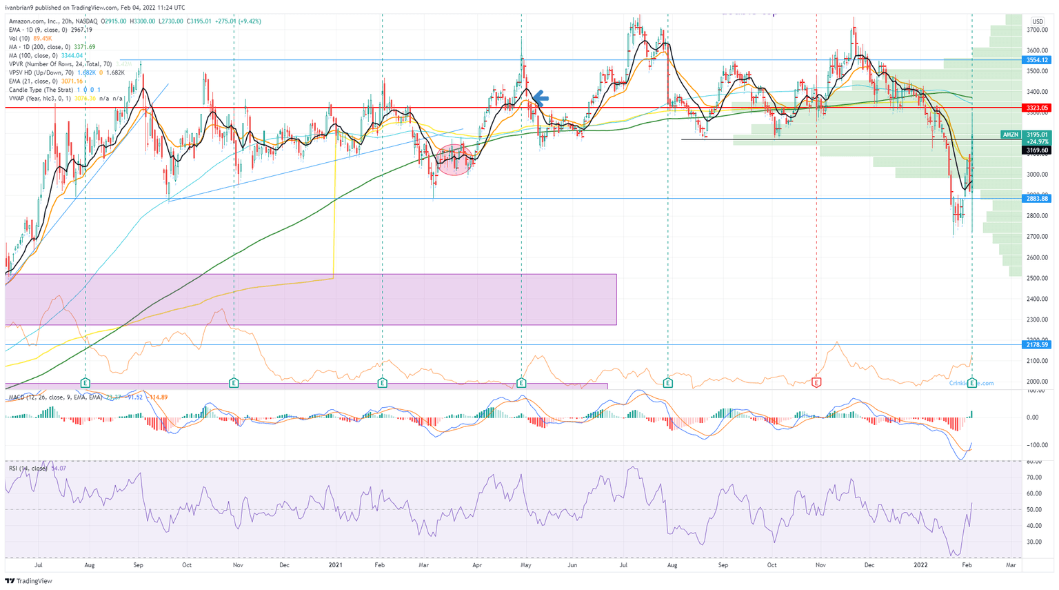 Amazon (AMZN) is riding to the equity market rescue this morning after Facebook parent Meta Platforms (FB) left investors teetering over the edge on Wednesday. Amazon announced a big beat on EPS and a small miss on revenue. Investors cheered the news and set Amazon shares surging higher in the aftermarket on Thursday night. This has renewed bullish sentiment. Currently, US futures are also up with the NASDAQ pointing to a 1% higher open for the tech index. We had identified in our preview that the pessimism from Facebook had tilted the risk-reward to the upside for Amazon earnings and so it proved.