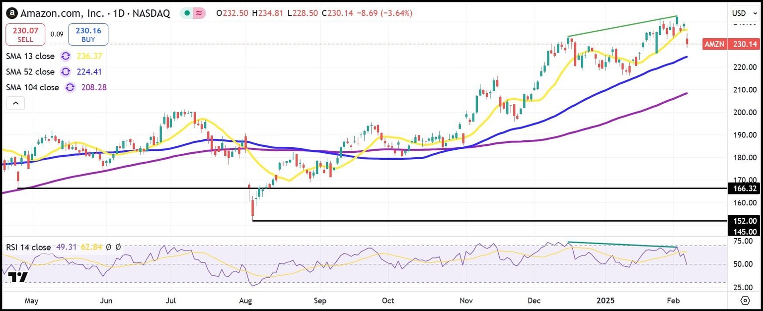 Amazon stock looks like it could use a pullback. The green trendlines on the daily chart below demonstrate a clear divergence between the Relative Strength Index (RSI) and the price chart. This type of divergence normally leads to a reversal.