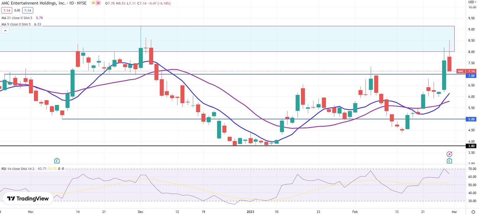 That is quite a distance below Wednesday's premarket price, but AMC is a volatile stock and there is not much strong support until that price level is reached. Of course, the 9-day and 21-day moving averages sandwich the $6 level, but neither moving average has been dealt much respect in the past six months. AMC stock trades on news and its meme stock reputation, not so much on technical levels.