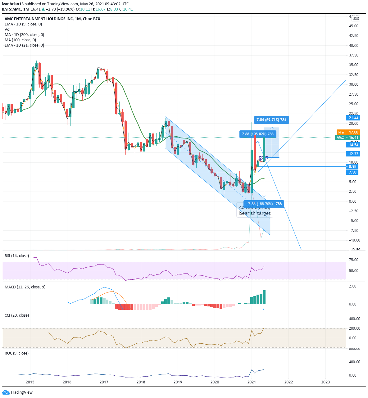 The monthly chart gives a much nicer view of the breakout and how well AMC shares have traded from a technical perspective. The breakout in January was confirmed with a surge in volume and an almost perfect retracement and retesting of the $7.50 breakthrough level. The monthly chart also shows the nice base around $2.50 that AMC had formed and defended multiple times.