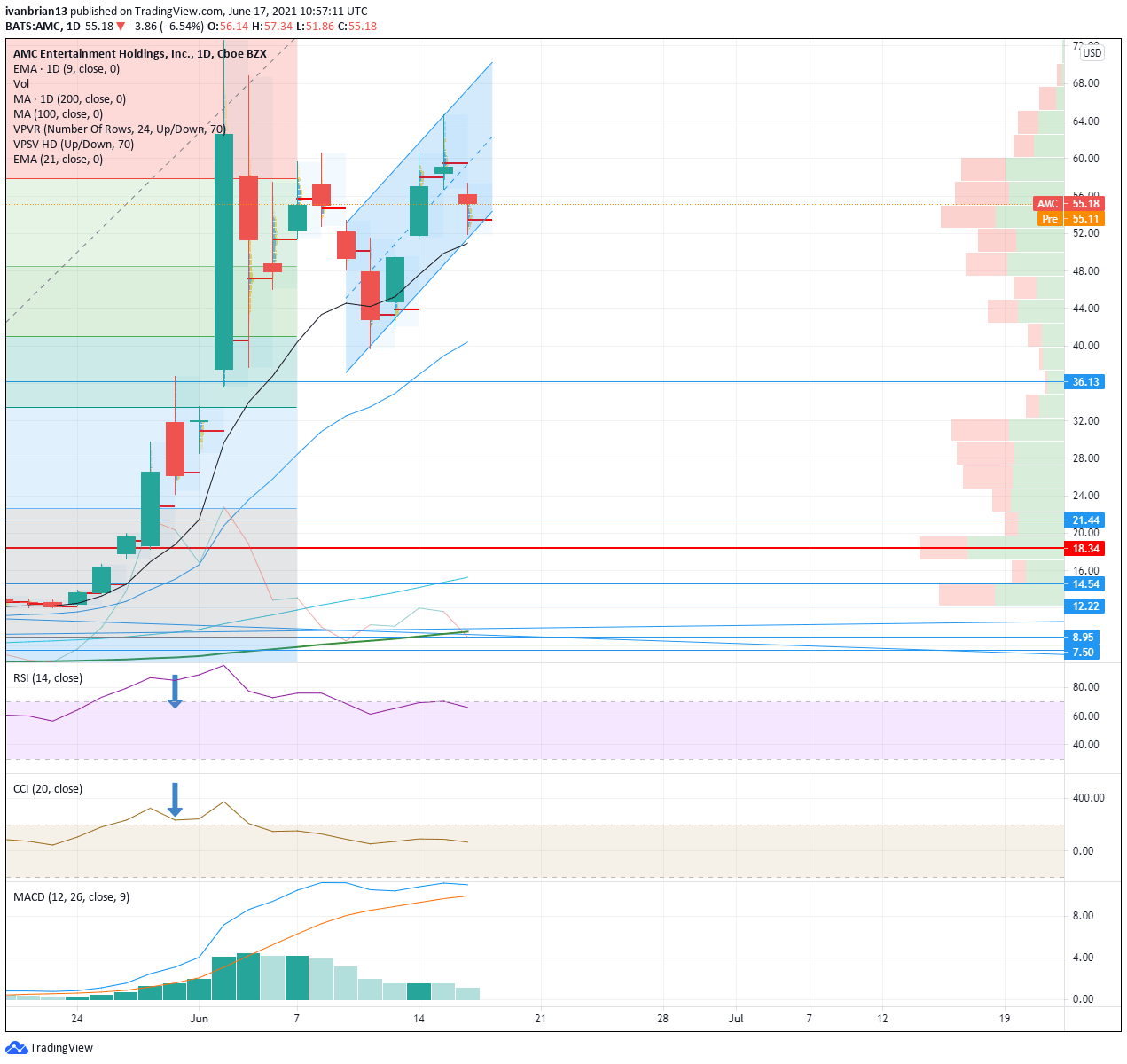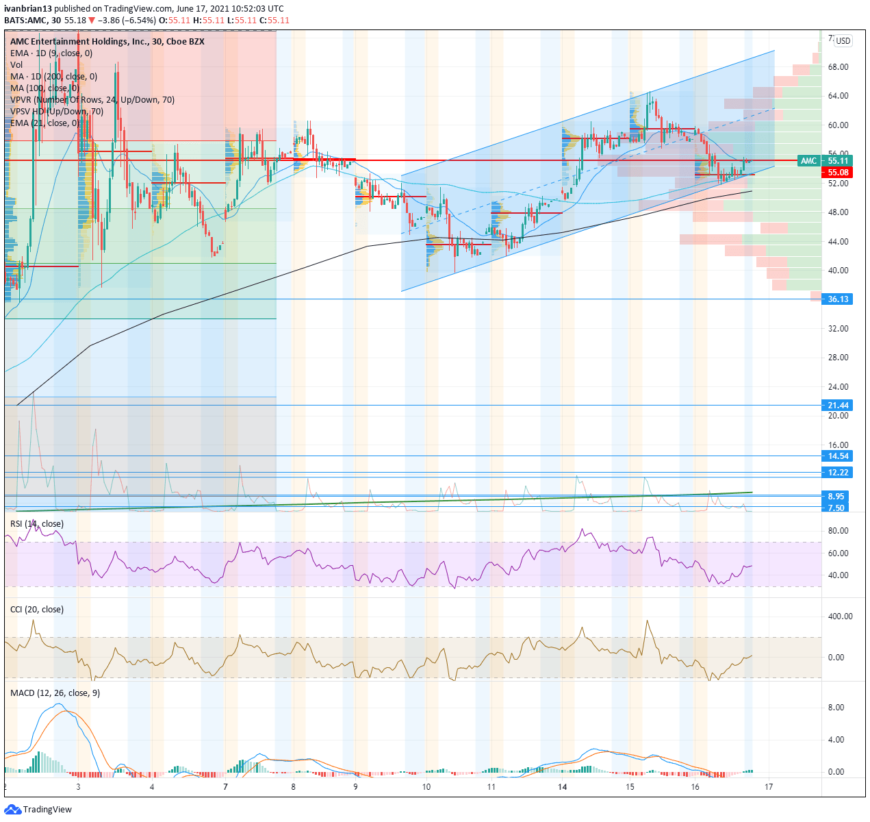 The AMC share price itself has been holding nicely above $50 for most of June so far. The 30-minute chart shows the uptrend in place, and the lower trend line has been acting as support on a short-term, intraday basis. This support is set today at $53.50 but obviously moves as time passes.