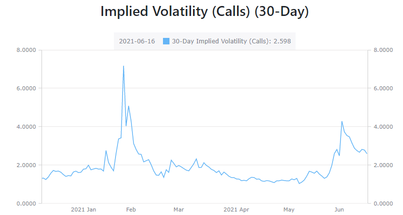 AMC shares continue to defy the odds, gravity and any other form of rational stock analysis as they continue to remain in orbit around the moon. AMC did drop over 6% on Wednesday, but given where the stock has come from, that is merely an intraday move for this type of volatility. Speaking of volatility, it remains hugely elevated. The chart below shows the implied volatility for AMC calls since the start of the GameStop (GME) rally in January. Currently, volatility sits at about 250%. By contrast, volatility for Apple is about 20%. The interesting point to note is despite the huge spike in the AMC stock price in this second wave, volatility has not been as high as back in the original move in January.