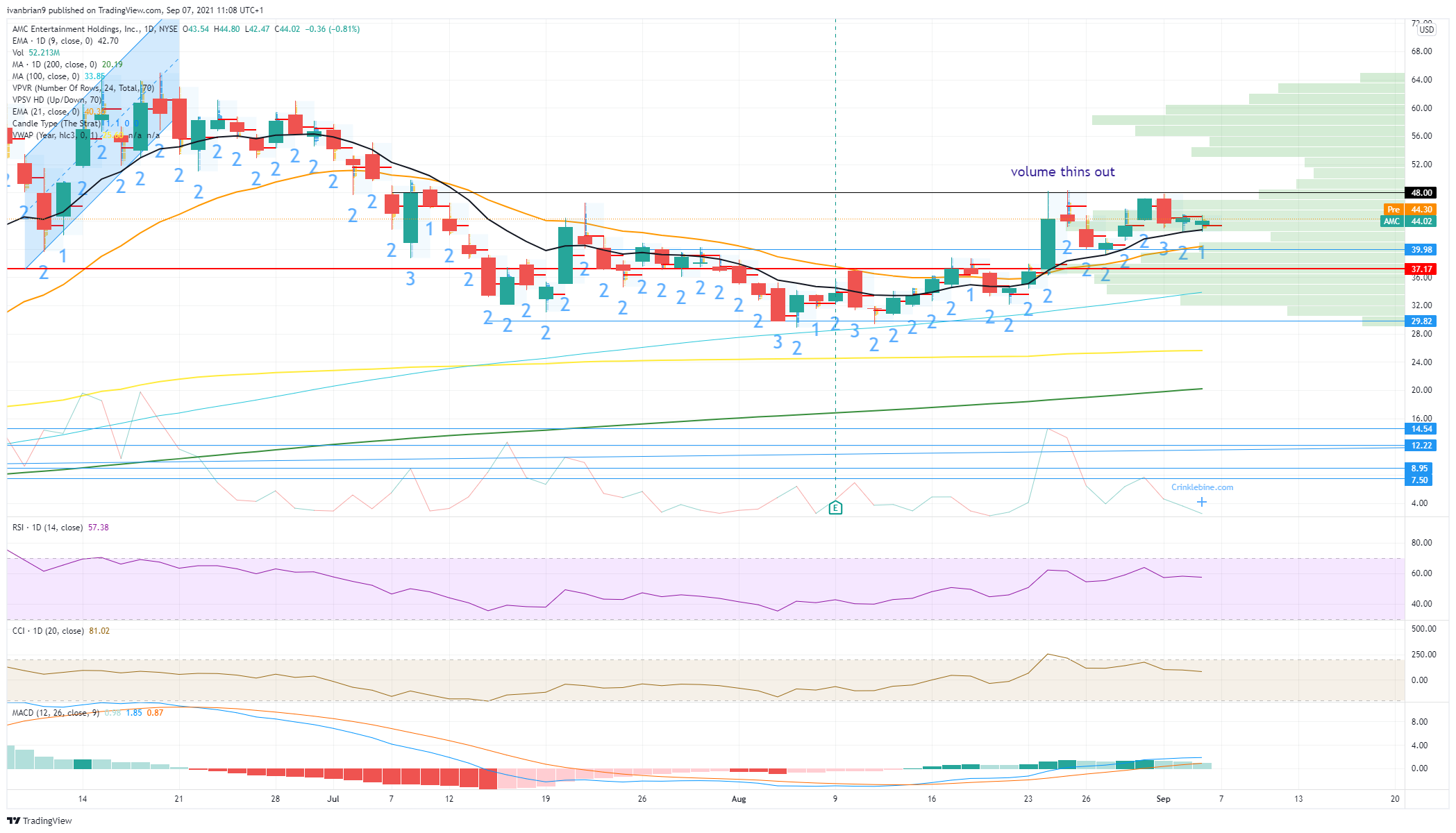The chart below shows why AMC is likely bound to break $48. The volume profile bars to the right show a volume gap or shelf, an area of low volume. Low volume usually means prices can move through more easily, meaning if AMC breaks $48 it can get through to the next high volume zone at $60 more easily. But the longer this takes, then the less likely it is to happen. AMC has had a few tests of $48 and failed, so one or two more and it really needs to go. Otherwise, the stock will be in danger of retracing back to $40. Breaking the latter level would end the short-term bullish move and put the stock back to neutral. Breaking $29.82 would put AMC into a bearish trend.