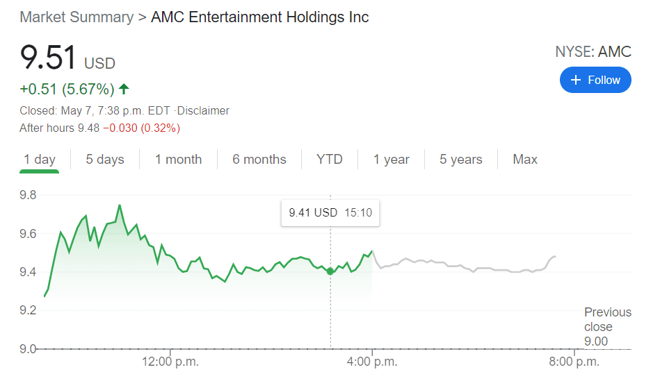 Update May 11: AMC shares bucked the trend on Monday rising nearly 3% and putting $10 firmly in their sights. The Nasdaq and most other retail interest stocks dumped but AMC bucked the trend. It was one of the few stocks in the green on Monday. Traders had been impressed with the conference call comments after releaseing results for Q1.