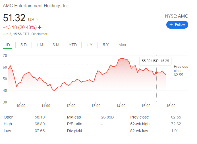 Update June 3: Wall Street edged lower on Thursday after the US Federal Reserve announced it would start unwinding a pandemic corporate credit facility, although US indexes got to bounce ahead of the close after the country reported impressive employment-related numbers. AMC shares traded alongside the market's sentiment, instead of the usual meme frenzy, dragged up and down by mood swings. It's down 20.43% for the day, but trading above $ 51.00 retaining most of its latest gains.