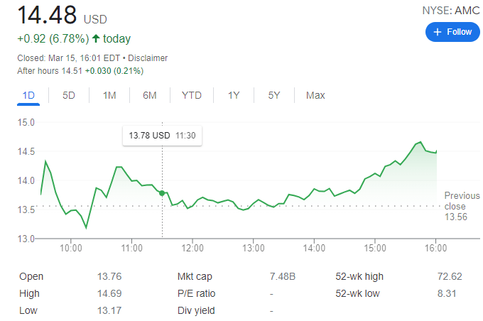 Update: AMC Entertainment added 6.78% on Tuesday, ending the day at $14.48 per share. The company benefited from the positive momentum of Wall Street, up ever since the day started. Equities advanced ahead of the US Federal Reserve monetary policy decision, expected to announce a 25 bps rate hike on Wednesday. At this point, a quarter-point hike has been long ago priced in, and such a decision will likely be considered dovish. Stocks may give up if US policymakers surprise market players with a 50 bps move. The Nasdaq Composite was the best performer, up 2.92%, while the Dow Jones Industrial Average added 573 points.