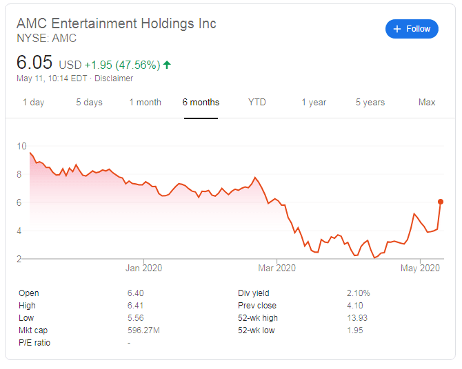 AMC, trading on the New York Stock Exchange, is trading at around $6 per share, up over 40% or nearly $2 dollar higher than the close price on Friday, which stood at $4.10. The 52-week low was seen in March, as the stay-at-home orders were imposed, while the 52-week high of $13.93 was recorded before the COVD-19 era.