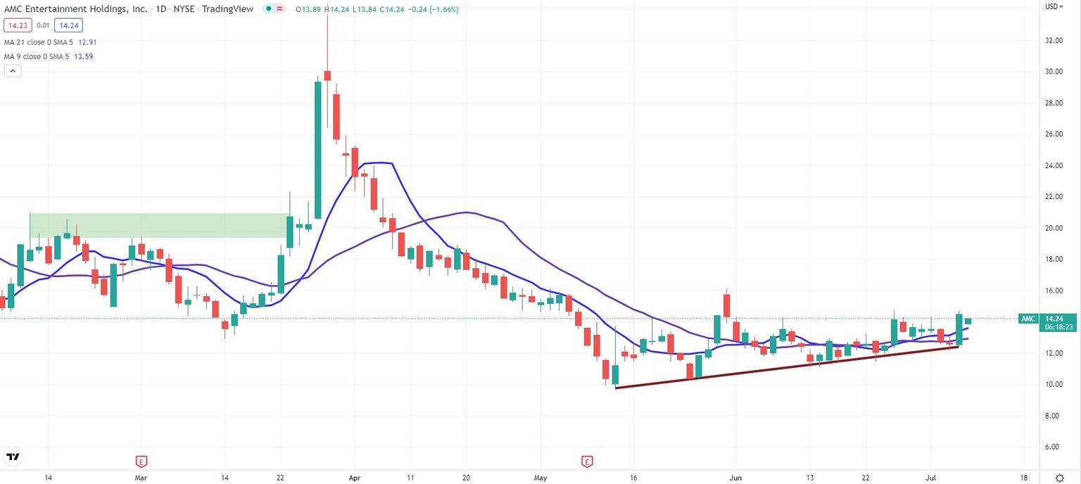 AMC stock has been riding an ascending bottom trend line that began back on May 12 close to two months ago. For what it is worth, that is impressive. It shows that there is enough belief in this beleagured name who are accumulating shares (buying the dip). The Moving Average Convergence Divergence also has been leading the signal line (orange) since May 18. These are two quite positive details. The third bit of optimism comes from the MACD rising above the zero threshold. This piece of evidence is enough to make me trust that an even greater rally is in the works (but probably not until August 4!).