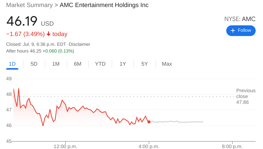 NYSE:AMC fell again on Friday, bringing its weekly losses to nearly 10% coming out of the July Fourth long weekend. Shares of AMC fell a further 3.65% to close the week at $46.19, barely staying above its 50-day moving average price of $46.09. The meme stock craze has died off recently, especially since GameStop (NYSE:GME) was added to the Russell 1000, which has provided less volatility for the stock.