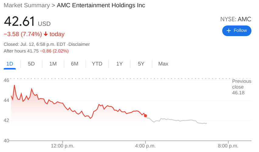 - NYSE:AMC dropped by 7.75% on Monday as the downward spiral continues.