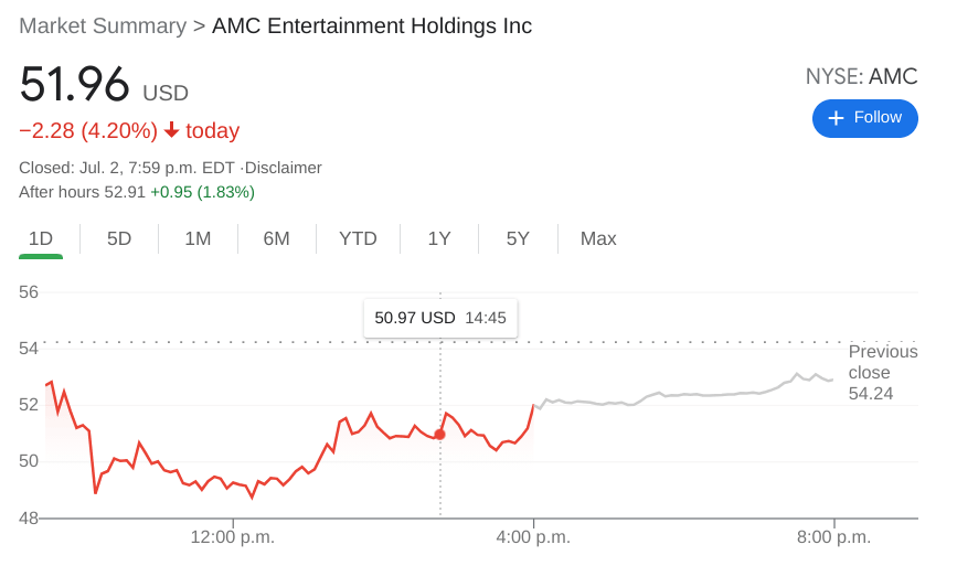 NYSE:AMC continued its descent on Friday, and it's unclear whether or not a hot weekend at the ticket booth can save the stock again. Shares of AMC fell by 4.17% to close the trading session at $51.96 heading into the July 4th weekend. The recent short squeeze is definitely running out of gas after the parabolic rise of AMC’s price has sent the stock higher than what the underlying fundamentals of the company can reasonably support.