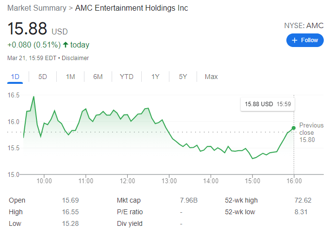 Update: AMC Entertainment edged marginally higher on Monday, ending the day at $15.88, up 0.51%. Wall Street turned south mid US afternoon, following comments from US Federal Reserve Chair Jerome Powell. Speaking in a private event about the economic outlook, Powell said that, given conditions are changing rapidly, Fed’s predictions could become outdated. Nevertheless, he also said that the central bank is prepared to hike the main rate by 50 bps in the next May meeting, while they might also start reducing the balance sheet. US indexes managed to bounce some ahead of the close, still ending the day in the red.