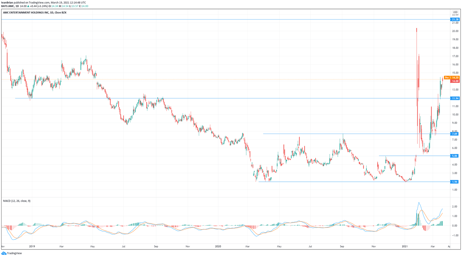 Update: Shares in AMC are suffering a steep fall on Monday. AMC shares are trading at $11.96, a drop of over 14%. Retail investors have been betting on AMC throughout 2021 but in order to survive the company had to raise capital. This diluted shareholders and increased debt. AMC needs a massive jump in future revenue streams to justify its current valuation metrics.