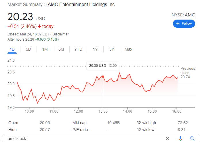Update: AMC Entertainment shed some ground on Thursday, as meme stocks were vulnerable despite the better tone of Wall Street. The stock finished the day at $20.23 down 2.46%. US indexes edged higher, but gains were modest. There was no progress in sentiment-related developments, but on the contrary, the situation in Eastern Europe keeps worsening. The best performer was the Nasdaq Composite, as it managed to add 1.83%, while the Dow Jones Industrial Average was up 1% and the S&P 500 added 49 points.