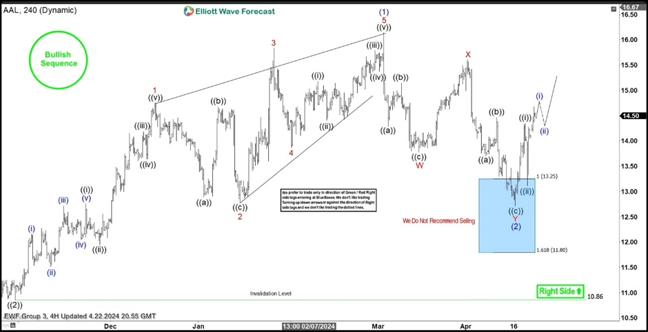 Current view suggests AAL stock is doing wave (2) blue correction. The price has reached extreme zone at 13.25-11.8 (blue box- buying area).