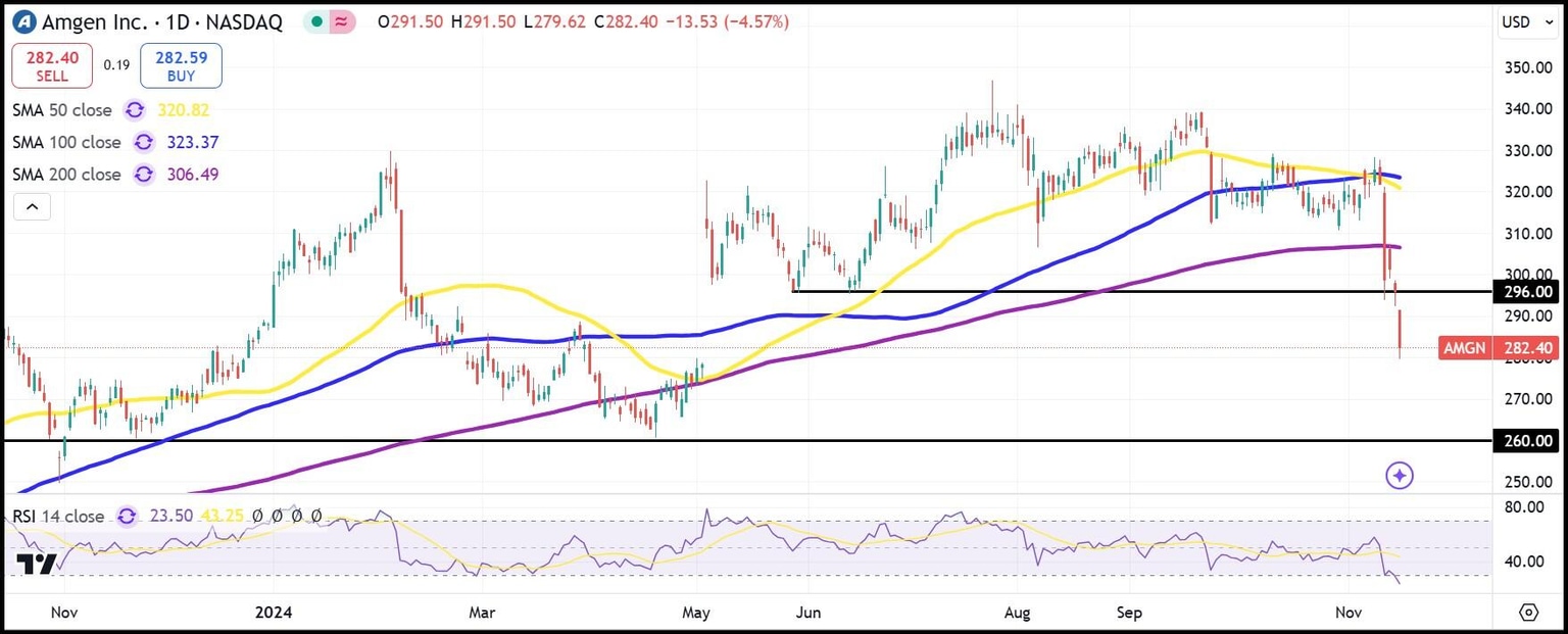 Amgen stock has been cratering so hard in the past week that it already had fallen below support at $296. That price level was tested on multiple occasions this past summer. Now expect AMGN stock to move swiftly toward 2023 support near $260.