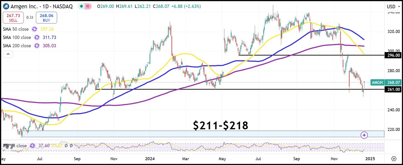 - AMGN stock has been in a downtrend since at least July.