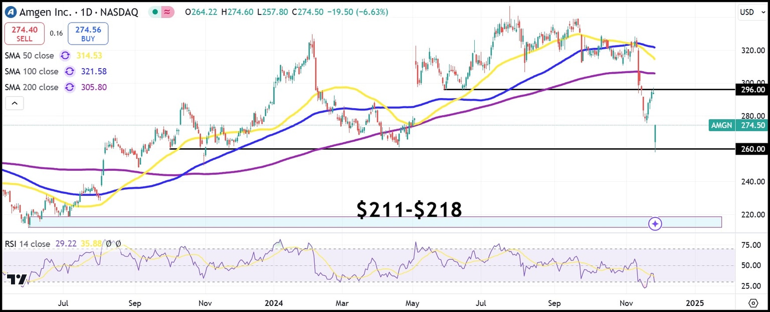 - AMGN stock slid below $258 before recovering into the $270s.