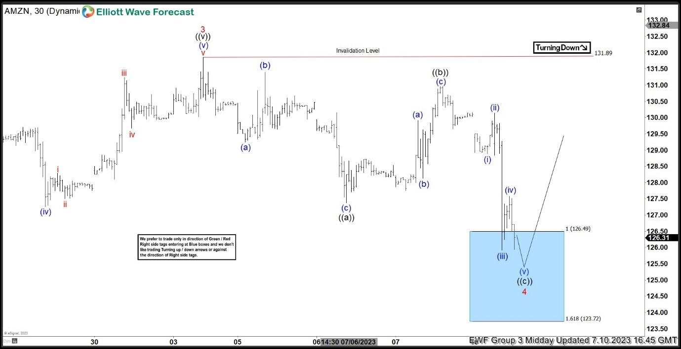 Here’s the 1hr Elliott wave chart from the 7/10/2023 Midday update. In which, the rally from the 5/01/2023 low unfolded in an impulse sequence where wave 3 ended at $131.85 high. Down from there, the stock made a pullback in wave 4 while the internals of that pullback unfolded as Elliott wave flat structure where wave ((a)) ended at $127.37 low. Wave ((b)) ended at $130.97 high and wave ((c)) managed to reach the blue box area at $126.49- $123.72 area. From there, buyers were expected to appear looking for the next leg higher or for a 3 wave bounce minimum.