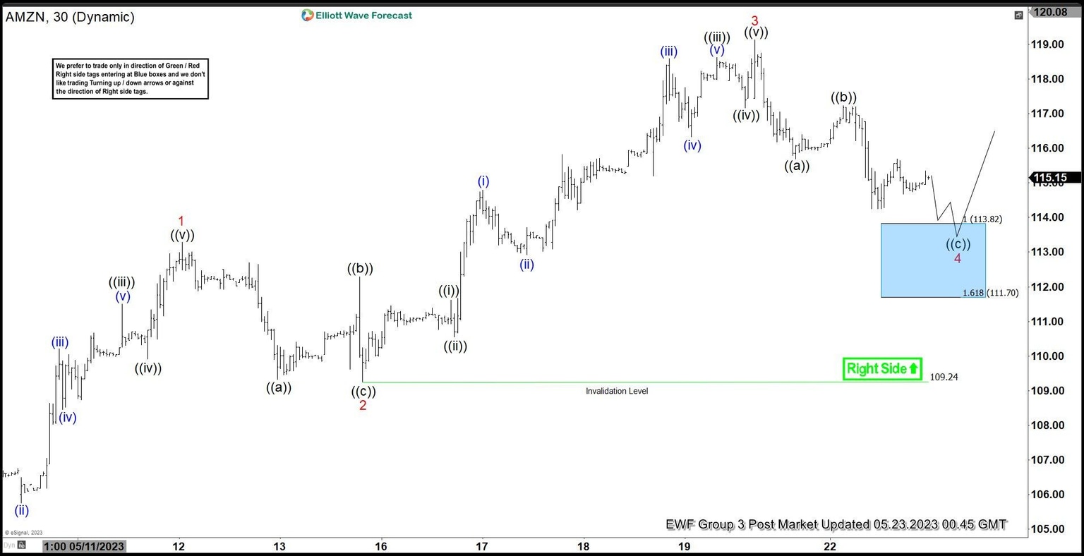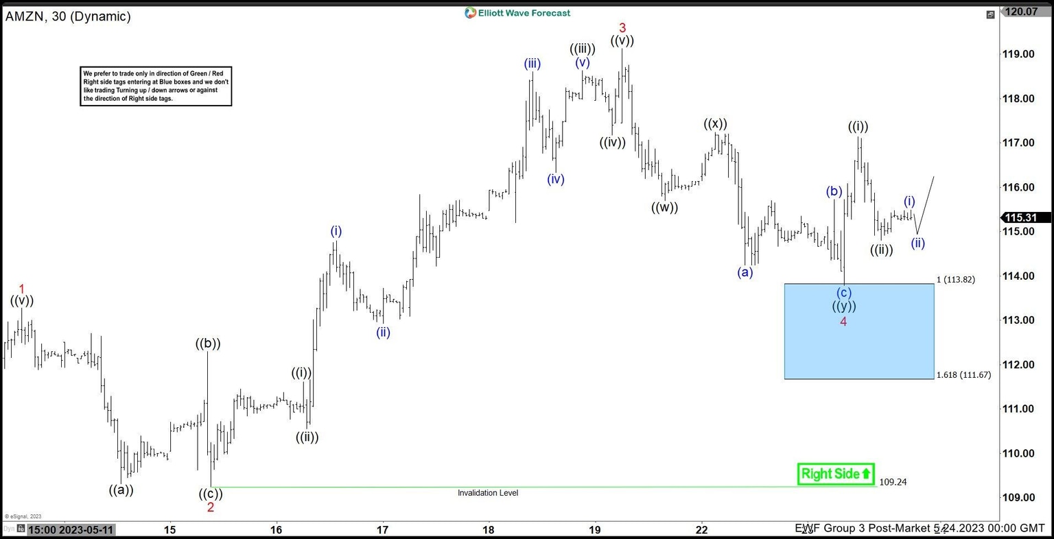 Here’s the 1hr Elliott wave chart from the 5/23/2023 Post-Market update. In which, the rally from the 5/01/2023 low unfolded in an impulse sequence where wave 1 ended at $113.28 high. Then wave 2 pullback ended at $109.24 & made a rally higher in wave 3 towards $118.75 high. Down from there, the stock made a pullback in wave 4 while the internals of that pullback unfolded as Elliott wave zigzag structure where wave ((a)) ended at $115.70 low. Wave ((b)) ended at $117.24 high and wave ((c)) managed to reach the blue box area at $113.82- $111.70 area. From there, buyers were expected to appear looking for the next leg higher or for a 3 wave bounce minimum.
