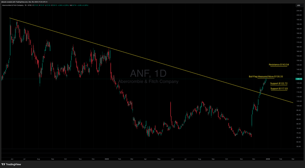 Looking at the technicals, Monday’s price action officially completed the bull flag measured move at $130.33 target established by the flag that formed back in early December. After a run this steep, the stock is looking near-term overextended. From a tactical standpoint, ANF is due for either a healthy pullback or a period of sideways consolidation before it can realistically take a shot at the next resistance level of $143.54.