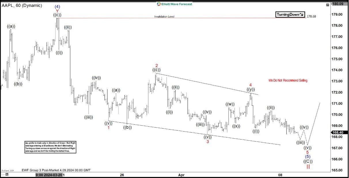 Short term Elliott Wave structure in Apple ($AAPL) suggests that the stock is correcting cycle from 1.3.2023 low in wave II. The rally to 199.62 on December 14, 2023 high ended wave I. Pullback in wave II is in progress as a zigzag structure. Down from December 14, wave ((A)) ended at 180.17 and rally in wave ((B)) ended at 196.38. Down from wave ((B)), wave (1) ended at 180.17 and wave (2) ended at 196.38. Wave (3) lower ended at 167.35 and wave (4) rally ended at 178.68 as the 1 hour chart below shows.