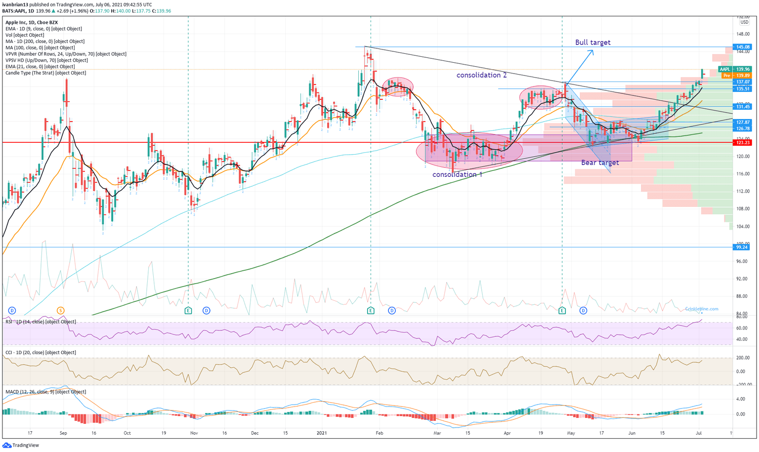 - The trend is your friend and this one is strong. As long as Apple remains above $137 and the 9-day moving average then further gains are probable.