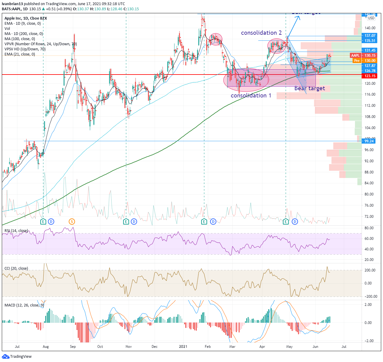 Now, it is best to step back and have a look at the bigger picture. The chart below shows the last year of the AAPL share price history. The point of control is $123.15. This is the strongest price with the highest amount of volume over the last year and so is a strong support level and equilibrium. As we can see, this is a large consolidation zone from March and April 2021. Apple stock broke out of this zone and traded higher, searching out record highs. Solid results, actually pretty spectacular results, with a 40% earnings beat were not enough to keep the momentum going, and Apple shares retreated to test this strong support zone again. This has worked, and Apple has pushed higher once more. Breaking $131.45 is the first target and then $135.51 to take out the higher consolidation zone.