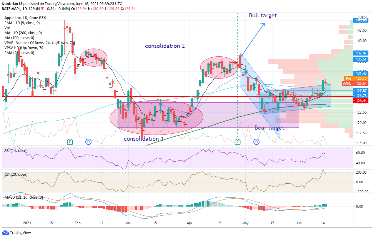 Apple shares remain well-supported with the point of control (highest volume price, i.e. equilibrium) being at $126.44 for 2021. The 200-day moving average sits at $124, so this area is strongly supportive. Apple shares have not traded below the 200-day moving average since March 2020. A break of $135 and more specifically $137 sees volume drop off sharply, meaning a price move above these levels will not have as much resistance to stop further gains. A call spread (buying near strike, selling far) will reduce the cost of what is a bullish strategy while admittedly limiting profits. But this may be the smart play as Apple is unlikely to explode higher like some of the meme stock names.