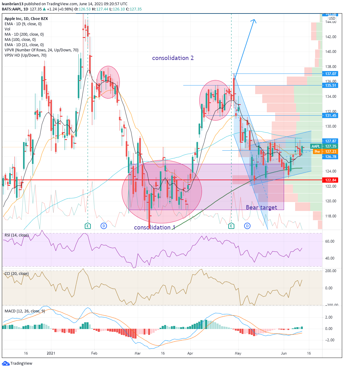 Regardless of the earnings, dividend and buybacks, the stock still sid post release. A $137 post-result high has steadily been depreciated down to $122. Currently, AAPL shares are moving back slightly to trade just over $127. AAPL shares retreated to a strong support zone and have been forming a base since. Volume above $128 begins to diminish, meaning AAPL shares may find it easier to push toward $135 on a break of $128. It is very obvious from the volume profile on the right of the chart that a break of $137.07, the post-earnings high, has a total lack of volume and could lead to an accelerated move to test record highs.