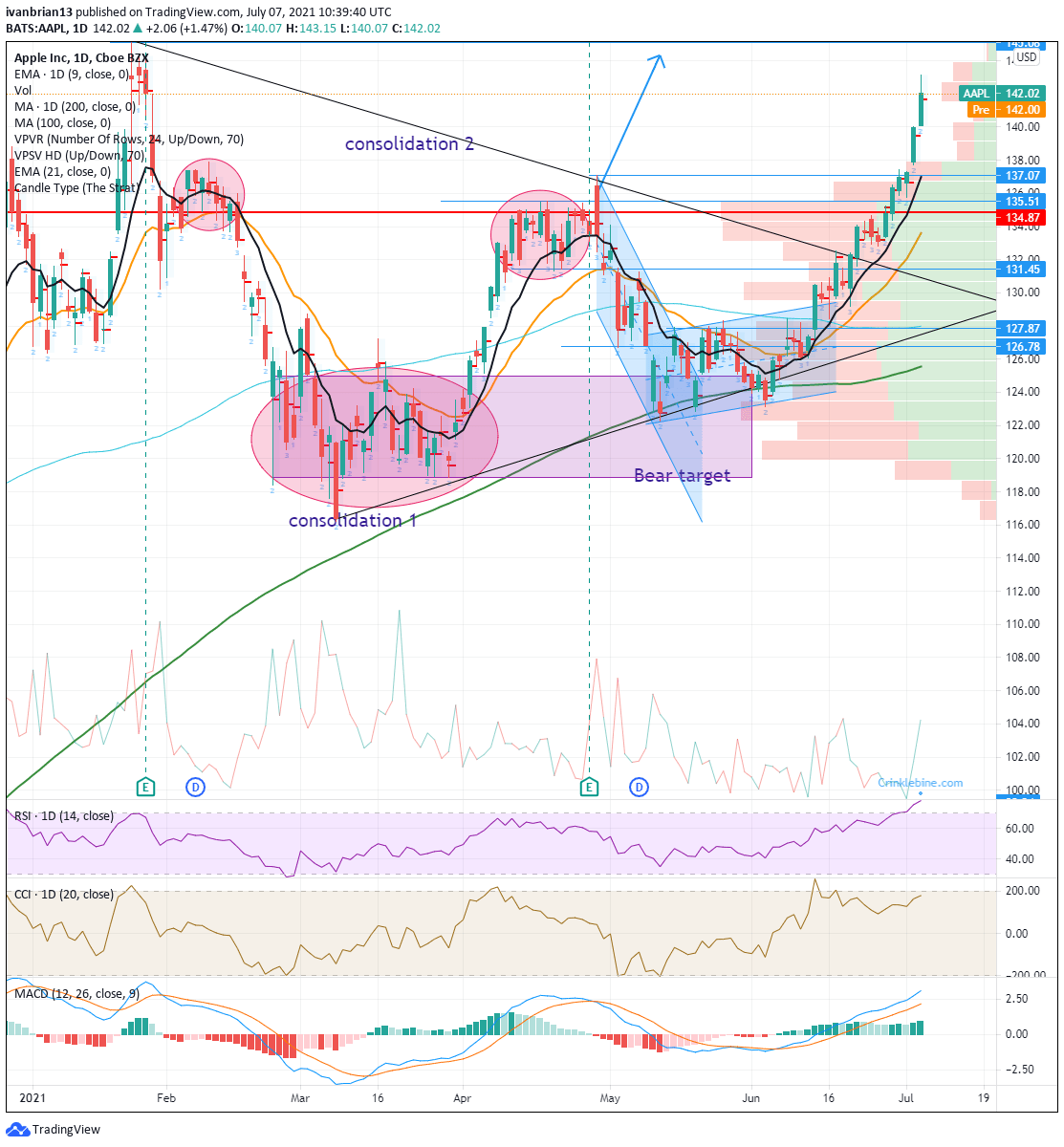 Update: Can we do it on Wednesday and set a new all-time high for Apple (AAPL) shares. The stock is clearly on track as it rises 1.5% to $144.22 in the first half hour of trading. The move has been fueled by breaking through $135 and $137 into areas of light resistance. Fundamentals were not the problem and now the technical picture has caught up with peers Facebook and Amazon.