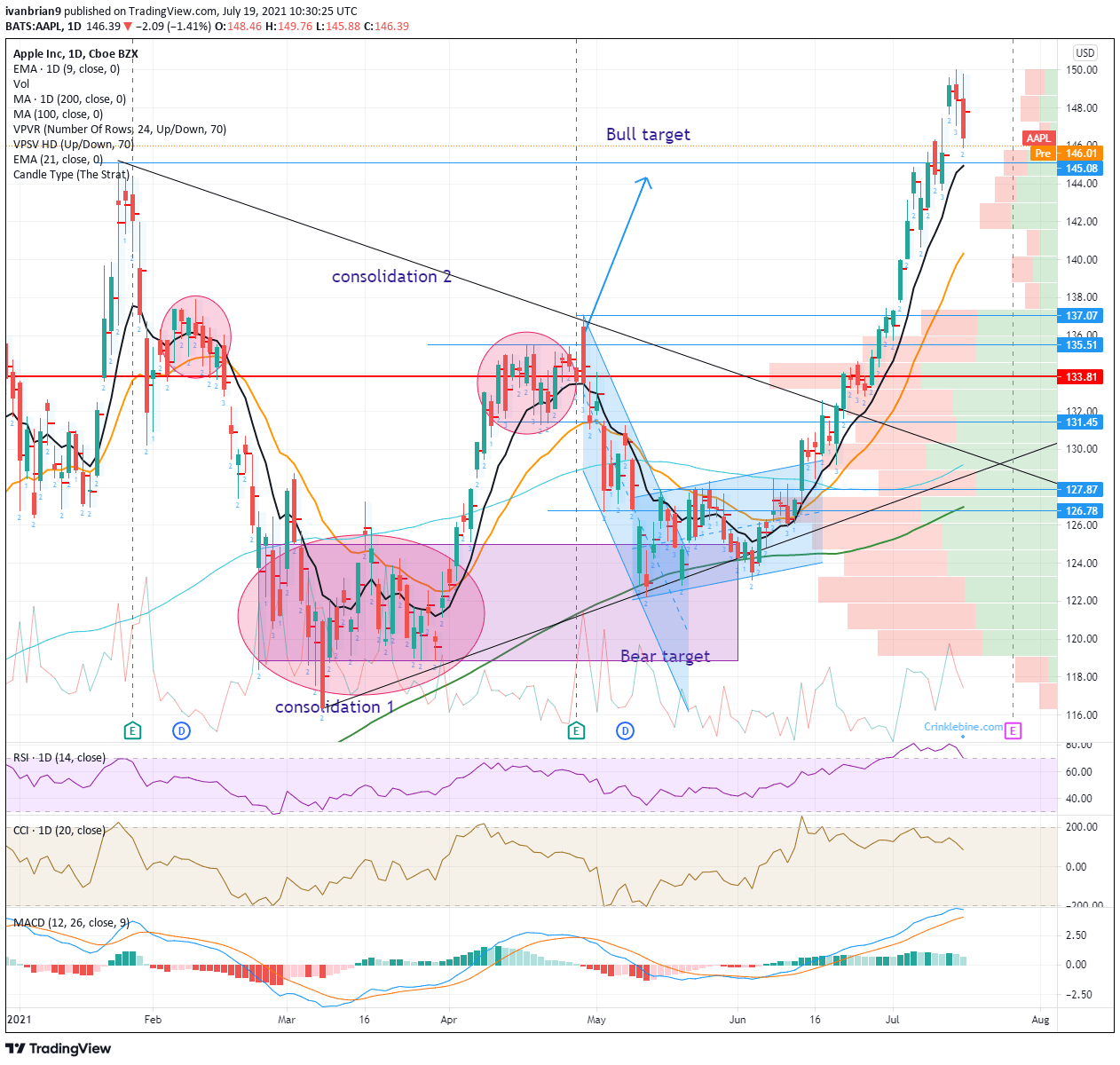 The recent move to new record highs we have been calling for since early June has stopped out for now at $150, a nice psychological round number. There are a few reasons at play here. The market has finally started to run out of bullish momentum with S&P, Nasdaq and other indices all showing fresh losses again on Monday. The seasonality effect is now over, the first two weeks of July are the most bullish of the year. Results are next week, so many traders who have ridden the recent strong trend will close positions ahead of results. Taking a position into a big event, be it earnings or some other announcement, means increased risk and dealing with an unknown outcome. Seasoned and pro traders will likely cut risk into such an event.