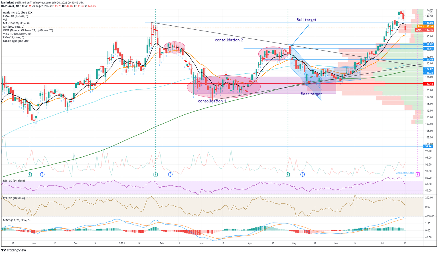 Apple shares suffered a pretty nasty fall on Monday with the tech behemoth giving up nearly 3% to close at $142.45. In the process, Apple stock broke the previous record high at $145.09 and also broke the 9-day moving average. The negative price action was not Apple related though, as stock markets across the globe suffered steep falls on Monday. High valuations were a concern and so too was the emergence and dominance of the Delta variant of covid.