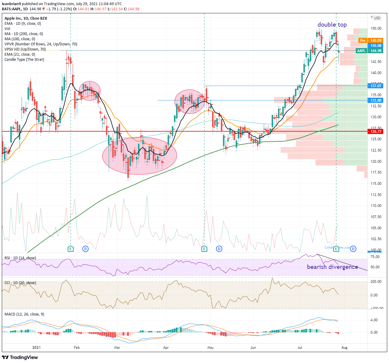 5. Another bonus is the bearish divergence in the Relative Strength Index (RSI) and the share price. Apple put in the double top on July 15 and 26. However, the RSI peaked for the first top and then diverged.