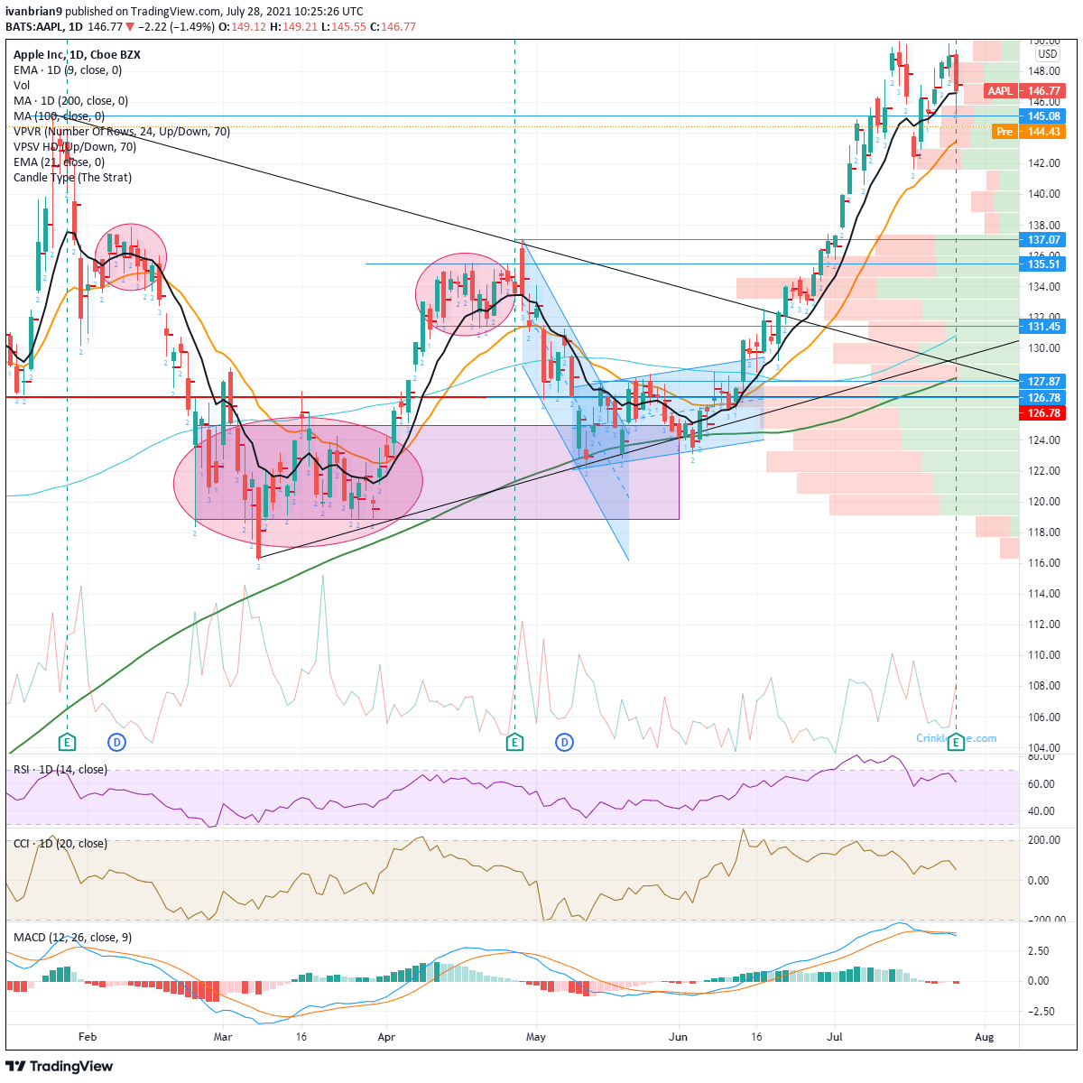 1. Apple failed to break the psychological $150 resistance and the Moving Average Convergence Divergence (MACD) has crossed into a bearish signal.