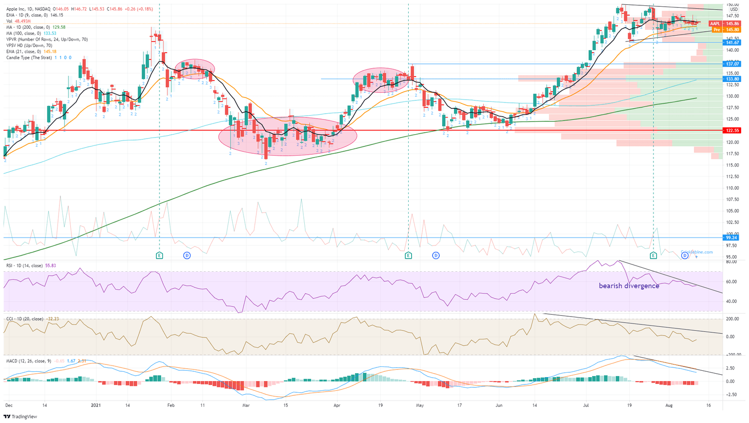 The Relative Strength Index (RSI), Commodity Channel Index (CCI) and Moving Average Convergence Divergence (MACD) are all trending lower from the first peak at $150 and did not match the second peak or double top. Apple was also cautious on the post-earnings conference call about outlook and guidance.