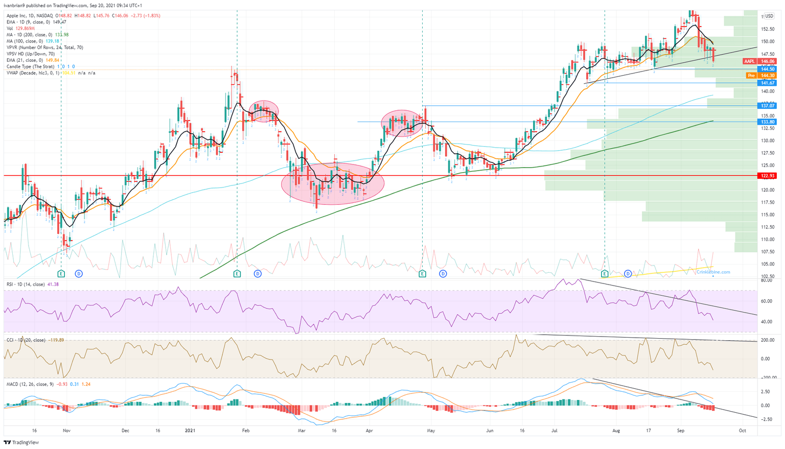 Apple is getting dangerously close to our bearish zone below $144.50. This is the low from August, and below $144.50 the volume profile thins out quite noticeably, meaning that price support is limited. Breaking $144.50 means we wait for support at $134 before thinking about entering the stock again. Momentum oscillators, the Relative Strength Index (RSI) and the Moving Average Convergence Divergence (MACD) are all pointing lower and trending down in confirmation of price action. Markets in Europe are already down nearly 2%, so this may be the day we turn bearish on Apple stock with a break of $144.50. Unless something interesting happens between now and the open of the US main session, we are going to break $144.50.