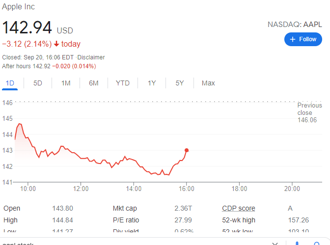 Update: Apple finished the first day of the week at $142.94 per share, down 2.14$. Stocks markets plummeted on the back of fears, as a Chinese property giant may fall into default, jeopardizing the country's financial system. Wall Street posted sharp losses, although the three major indexes managed to bounce from intraday lows ahead of the close. The Nasdaq Composite shed 303 points, while the DJIA closed 614 points lower. The S&P 500 lost 1.85%.