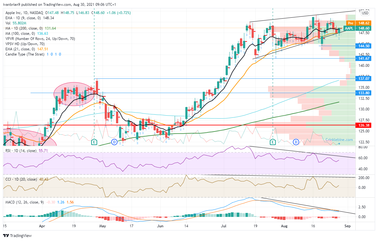 Update August 31: AAPL ended Tuesday down 0.84% at $151.83, retreating from an intraday high of $152.80. The share hit an all-time high on Monday after market talks suggested that Google could increase its annual fee to retain its place as the default search option on iOS to $15 billion this year. The AAPL retreated just modestly amid investors adopting a cautious stance ahead of the release of US employment-related data, that can twists Federal Reserve Chair Jerome Powell's view on tapering.