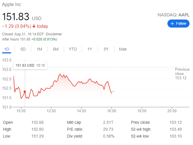 Update September 1: AAPL stock price stalled its record run and eased slightly on Tuesday amid profit booking as the August month drew to an end. AAPL shares fell 0.84% a day before to settle at $151.83, having clocked fresh all-time highs at $153.49 on Monday. Mixed US economic data revived growth concerns, which weighed on the broader market sentiment, in turn, impacting AAPL stock. Meanwhile, the news that Apple may integrate satellite services into its next iPhone drove the price to record highs earlier on.