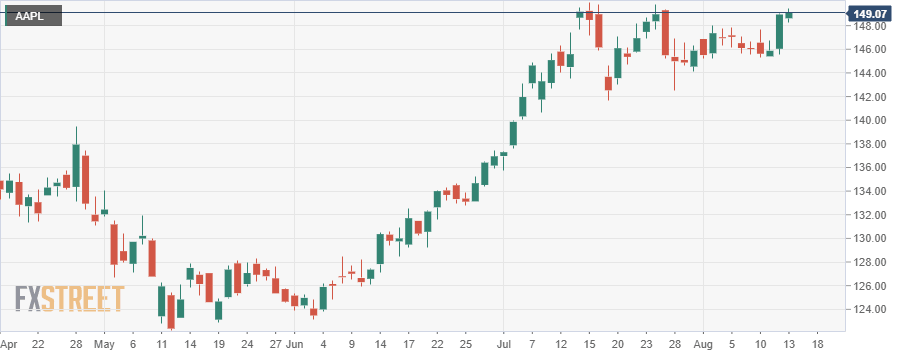 Apple continues to consolidate just under all-time highs and prepare itself to break out of a tightening range. The recent price movements, except for Thursday, have been in a tight range with few strong moves seen on any day. Friday was no different and Apple stock closed at $149.10 for a change of just +0.1%. The stock remains poised to break out and target all-time highs at $150. The recent run of low volatility and low daily trading range has seen Apple form a wedge formation. Friday saw Apple trade up to the top of this wedge, so will the stock push on and break through or retreat? FXStreet still favours the more bearish arguments, but our patience is being stretched. Monday can usually be a tough day for equities and historically is one of the worst for equity performance, so let us see if this and other headwinds combine to send Apple lower. Either way our options call from last week continues to work well. We called a strangle play to benefit from a breakout higher or lower. Strangles involve buying a put and call for the same expiration but with different strikes. They are useful if you expect a stock to breakout but are not sure which direction. A breakout is usually preceded by a period of consolidation and low volatility, which reduces option premiums.
