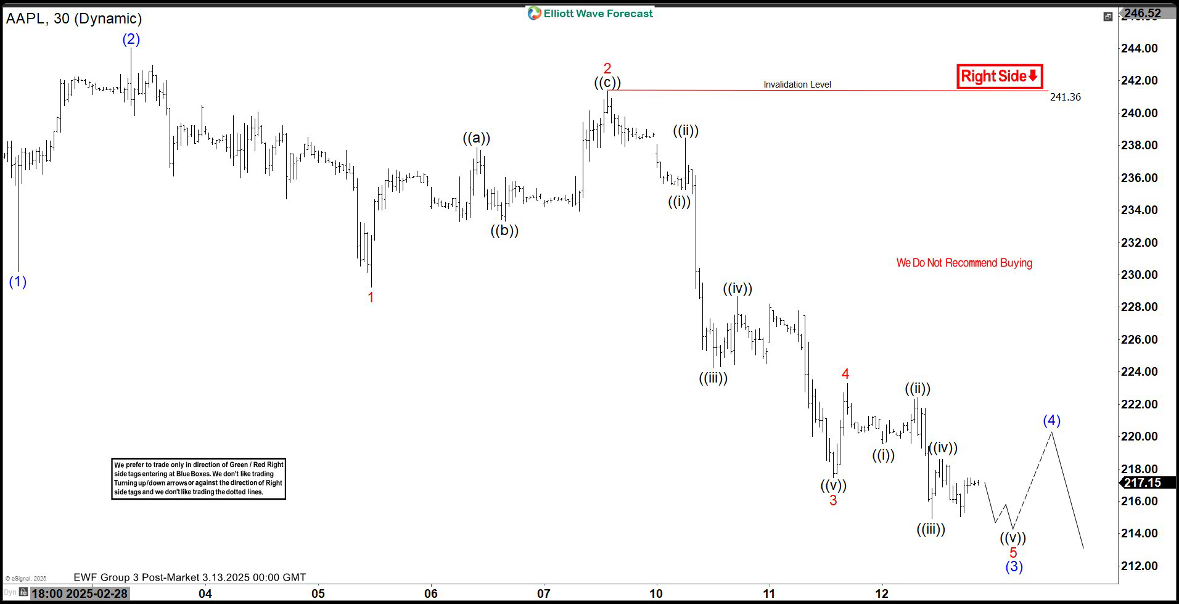 Apple (ticker: $AAPL) shows incomplete bearish sequence from 12.26.2024 peak and looking for further downside. Down from 12.26.2024 peak, wave ((A)) ended at 218.06 and wave ((B)) ended at 250. Wave ((C)) lower is in progress as a 5 waves impulse Elliott Wave structure. Down from wave ((B)), wave (1) ended at 230.2 and wave (2) ended at 244.03 as the 30 minutes chart below shows.
