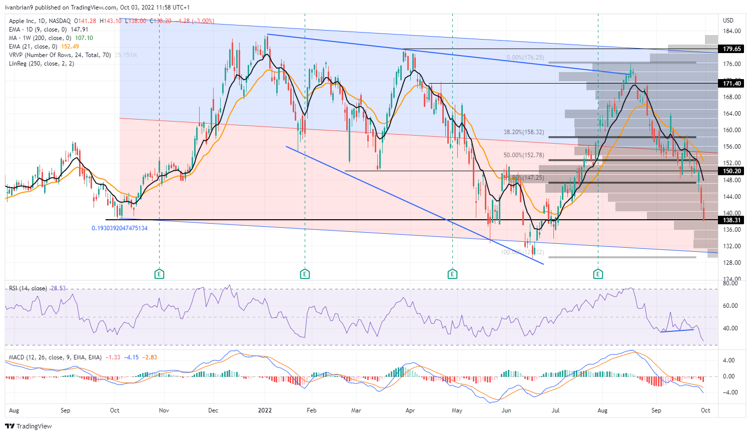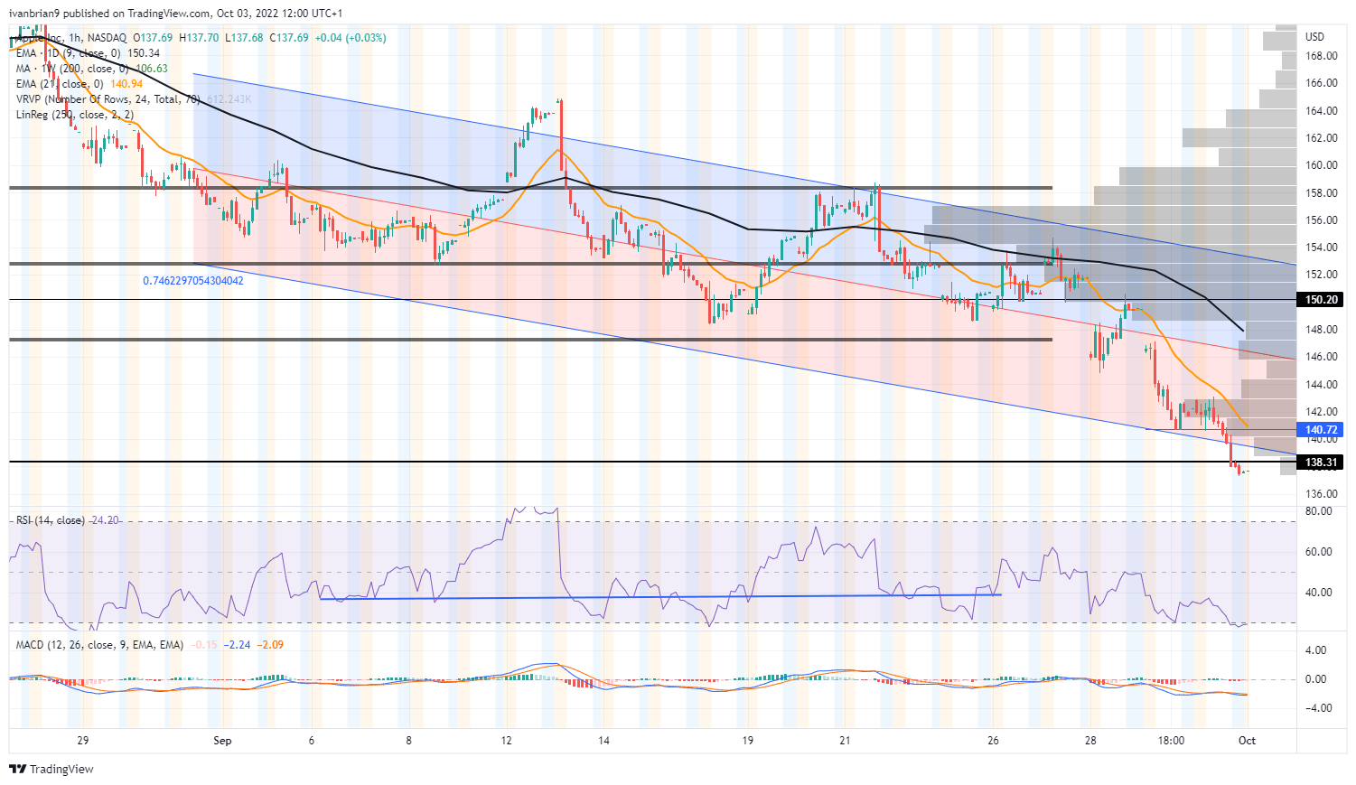 Below we show the hourly chart. Again it looks oversold with Apple stock moving outside the regression channel. $140.74 is my pivot, and then the gap to $149.44 would be targeted.