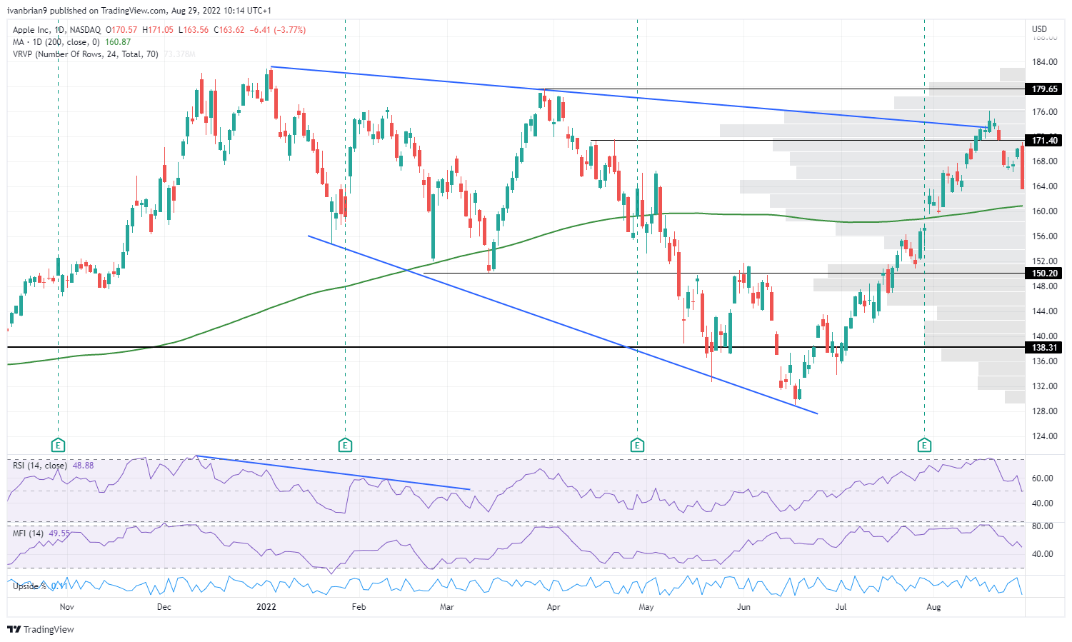 Equity markets look likely to be in for a tough Autumn after Powell carefully scripted the narrative on Friday. Remember, he had most of the summer to plan out what he wanted to say. So he knew the importance of citing Vockler, and he knew what he wanted to achieve when he used words like "pain" and "below trend growth". The plan was well thought out. He wants equity markets lower to hit demand and so bring inflation down. Whatever Apple does may struggle to overcome such a challenging macro backdrop.